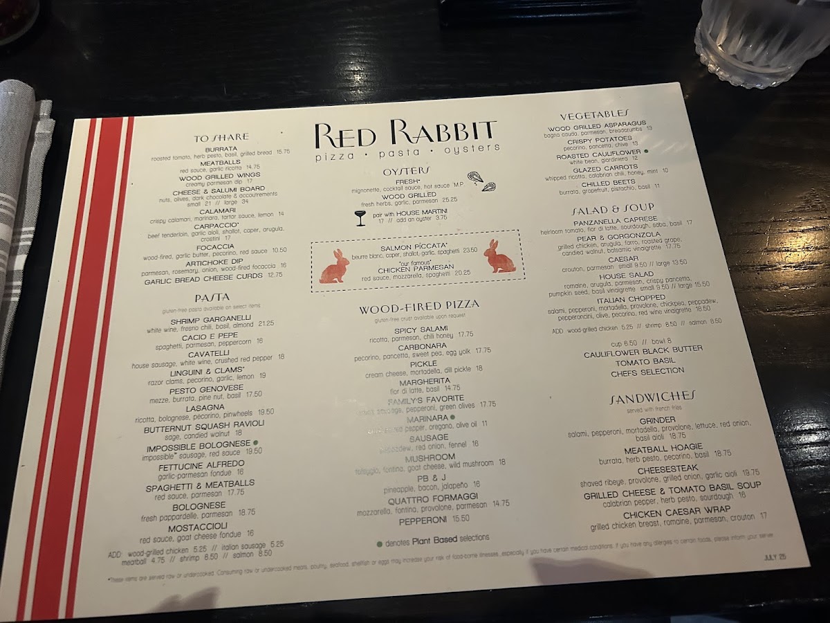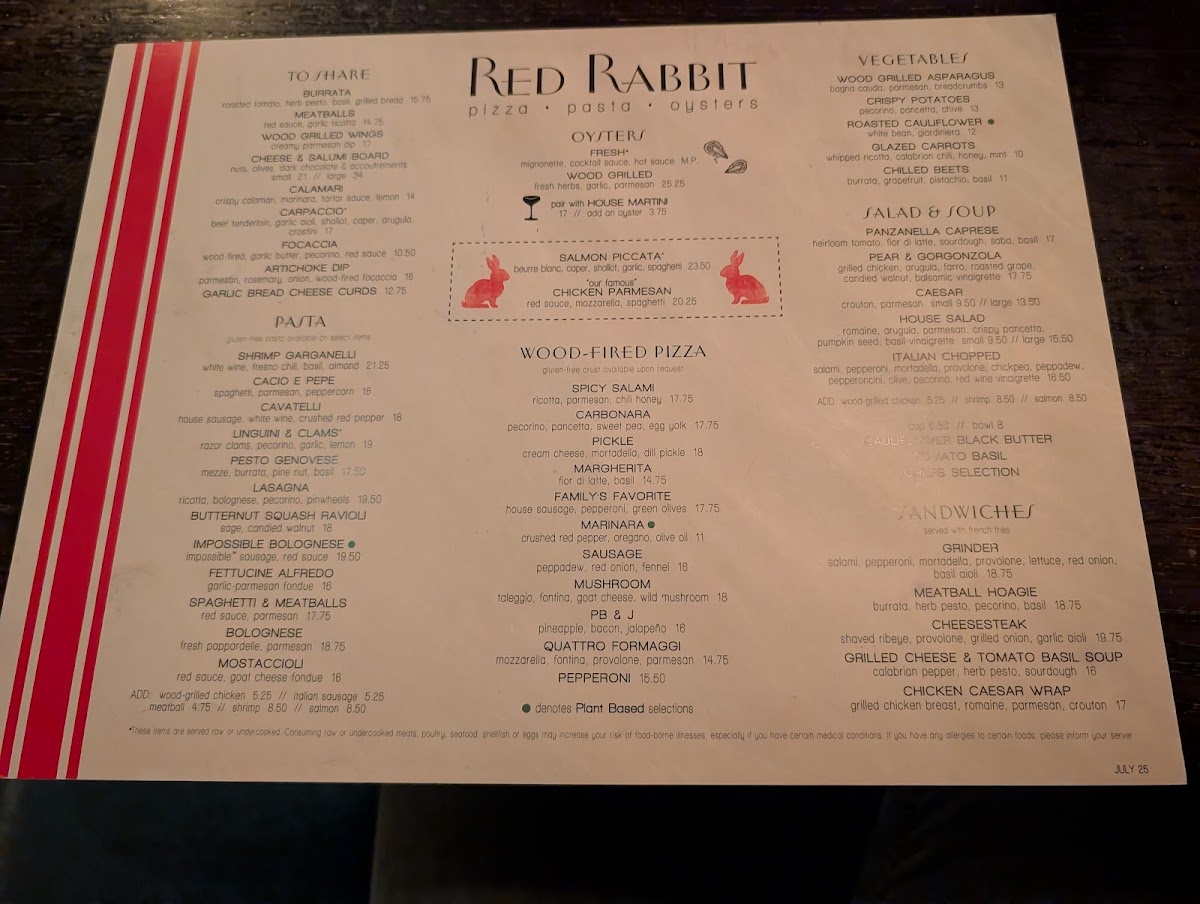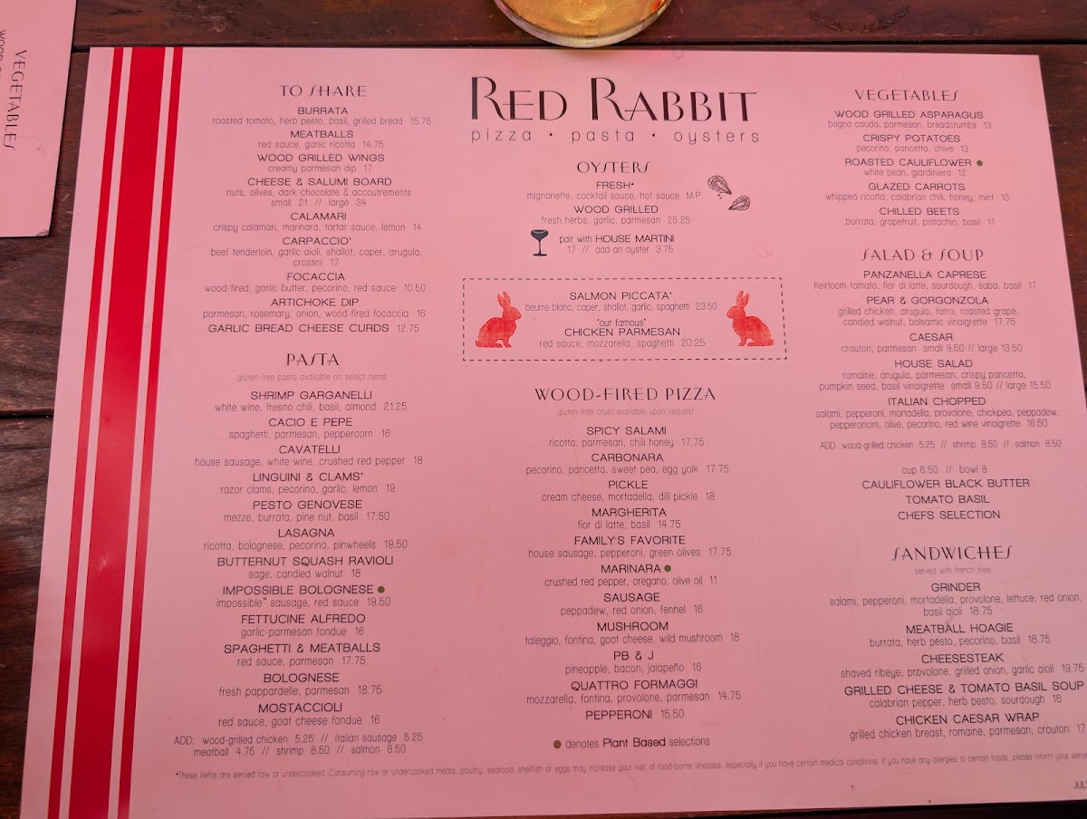 The menu at Red Rabbit Minneapolis offers a balanced mix of comforting Italian classics and familiar favorites, perfect for relaxed breakfasts, leisurely brunches, or casual dinners. You’ll find a thoughtful selection of dishes ranging from wood-grilled oysters and fresh pasta like cavatelli and gnocchi to approachable sandwiches and pizzas, including options that appeal to diverse tastes such as a vegan marinara pizza.